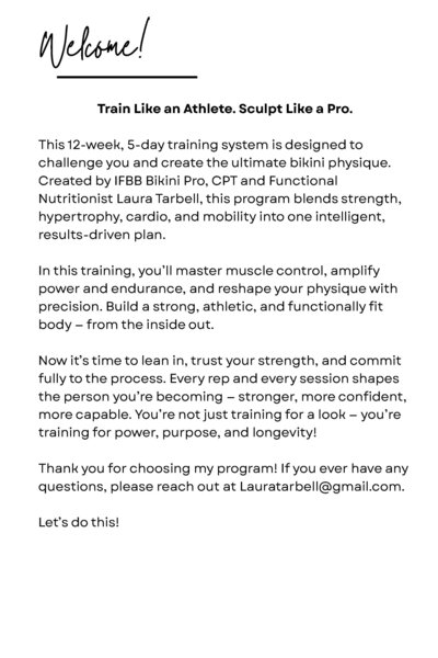 Push your limits with the Advanced Bikini Training Program — a 12-week, 5-day advanced training system designed by IFBB Bikini Pro and Functional Nutritionist, Laura Tarbell. This program combines strength, hypertrophy, cardio, and mobility for a complete performance and physique transformation.